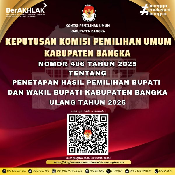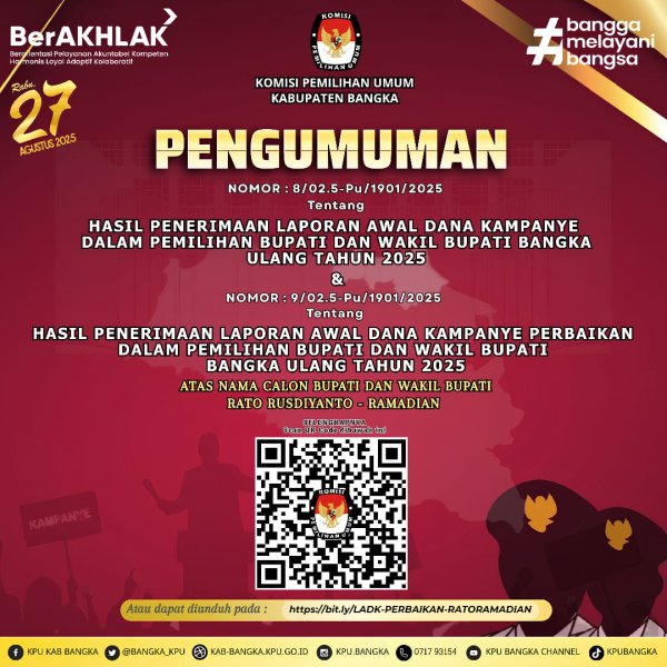 Berikut kami sampaikan pengumuman nomor 8/02.5-Pu/1901/2025 tentang hasil penerimaan laporan awal dana kampanye dalam pemilihan bupati dan wakil bupati bangka ulang tahun 2025 dan pengumuman nomor 9/02.5-Pu/1901/2025 tentang hasil penerimaan laporan awal dana kampanye perbaikan dalam pemilihan bupati dan wakil bupati bangka ulang tahun 2025 Atas Nama Calon Bupati dan Wakil Bupati Rato Rusdiyanto dan Ramadian #KPURI #KPUKabupatenBangka #KPUMelayani #PilkadaUlang2025 ....