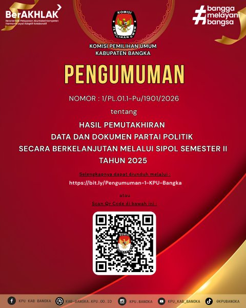 #Teman Pemilih berikut Pengumuman Nomor: 1/PL.01.1-Pu/1901/2026 tentang Hasil Pemutakhiran Data dan Dokumen Partai Politik secara Berkelanjutan Melalui Sistem Informasi Partai Politik (Sipol) Semester II Tahun 2025 Berdasarkan hasil verifikasi terhadap data dan dokumen pemutakhiran Partai Politik, dengan ini disampaikan hasil pemutakhiran data dokumen Partai Politik secara berkelanjutan melalui Sipol Semester II Tahun 2025, sebagai berikut, klik link pengumuman berikut :Dokumen Pengumuman ....