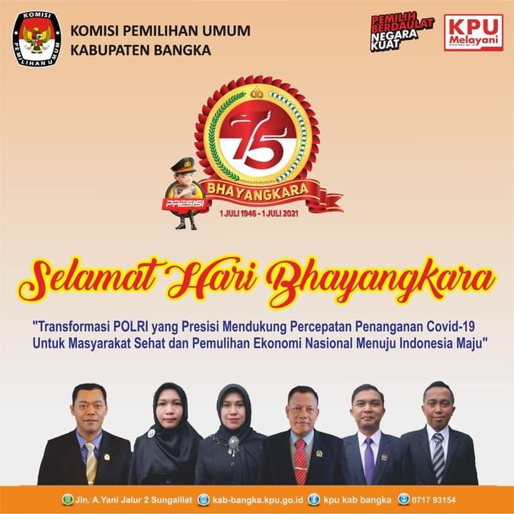 Komisi Pemilihan Umum Kabupaten Bangka Mengucapkan Selamat Hari Bhayangkara Ke - 75 " Transformasi Polri Yang Presisi Mendukung Percepatan Penanganan COVID 19 Untuk Masyarakat Sehat Dan Pemulihan Ekonomi Nasional Menuju Indonesia Maju.