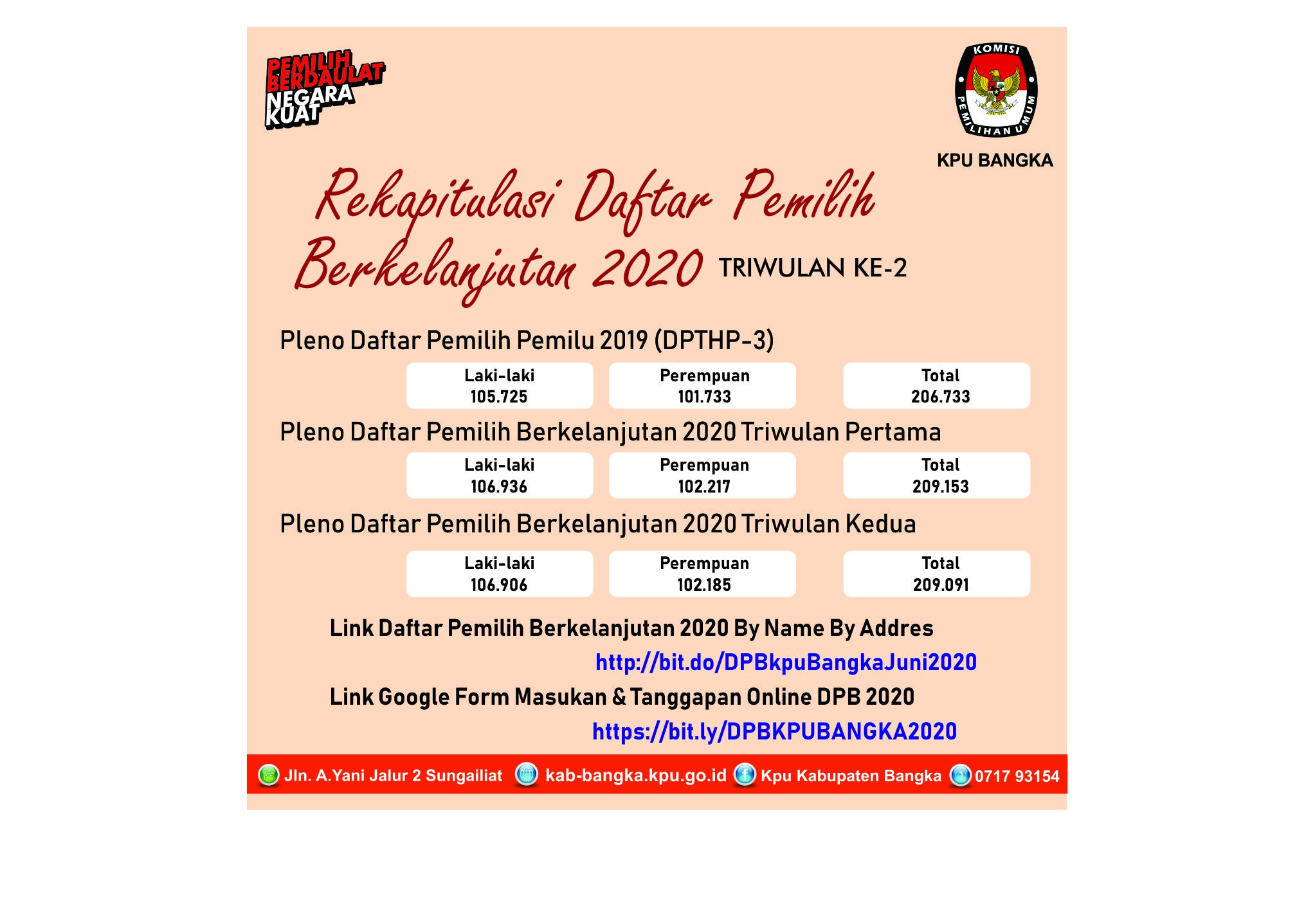 Kpu Kab Bangka melaksanakan kegiatan rutin Pemutakhiran Daftar Pemilih Berkelanjutan 2020. Link Daftar Pemilih Berkelanjutan 2020 By Name By Addres dapat diunduh di http://bit.do/DPBkpuBangkaJuni2020 . Masyarakat dapat TANGGAPAN MASYARAKAT TERHADAP DAFTAR PEMILIH PEMILU TAHUN 2019 secara ONLINE dengan link sebagai berikut :https://bit.ly/DPBKPUBANGKA2020