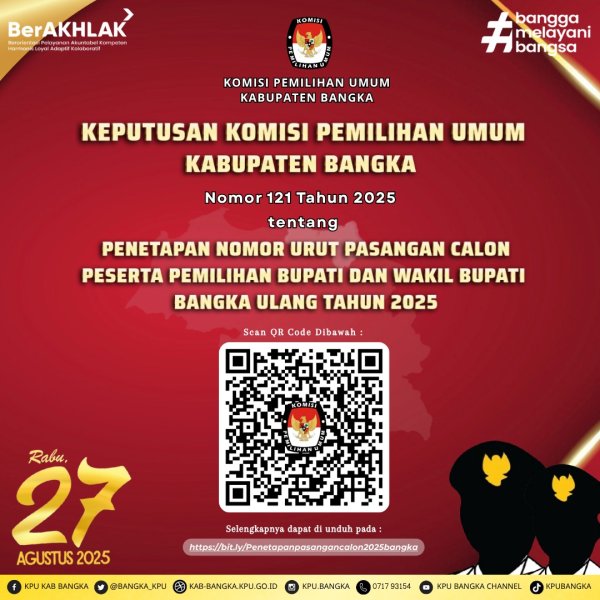 Berikut kami sampaikan Keputusan KPU Kabupaten Bangka mengenai Penetapan Nomor Urut Pasangan Calon Peserta Pemilihan Bupati dan Wakil Bupati Bangka Ulang Tahun 2025