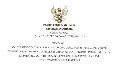 Jakarta, kpu.go.id - Pengumuman Nomor 51/PP.06-Pu/05/KPU/VII/2019 Tentang Calon Anggota Tim Seleksi Calon Anggota KPU Provinsi Lampung dan Tim Seleksi Calon Anggota KPU Kabupaten/Kota di Provinsi Lampung Periode 2019-2024 untuk Tanggapan Masyarakat.