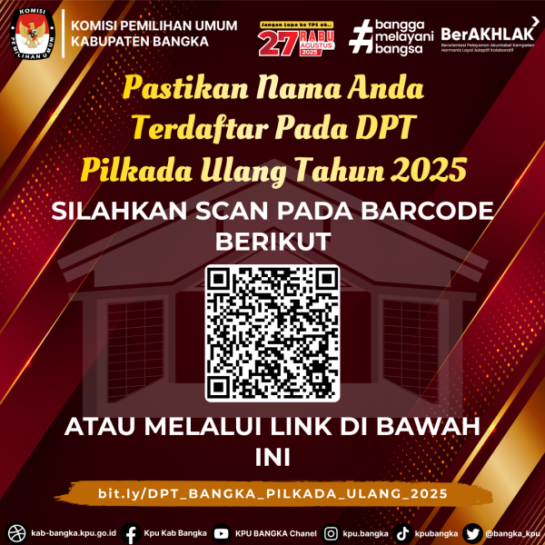 Komisi Pemilihan Umum (KPU) Kabupaten Bangka telah melakukan rapat pleno terbuka rekapitulasi dan penetapan daftar pemilih tetap (DPT) pada pemilihan Bupati dan Wakil Bupati Bangka ulang 2025 di ruang pertemuan Parai Tenggiri Kantor Bupati Bangka, Selasa (24/6/2025).