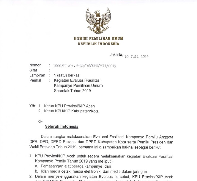 Jakarta, kpu.go.id - Surat Edaran Ketua KPU RI Nomor 100/PI.01.6-SD/06/KPU/VII/2019 Tanggal 10 Juli 2019, Perihal Kegiatan Evaluasi Fasilitasi Kampanye Pemilihan Umum Serentak Tahun 2019.
